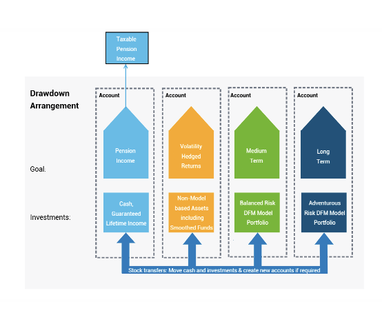 In this example, four separate accounts can be created by the adviser – one to generate pension income, another to hedge against market volatility, with two further pots to account for medium and long-term needs – with each account adopting a different investment strategy.